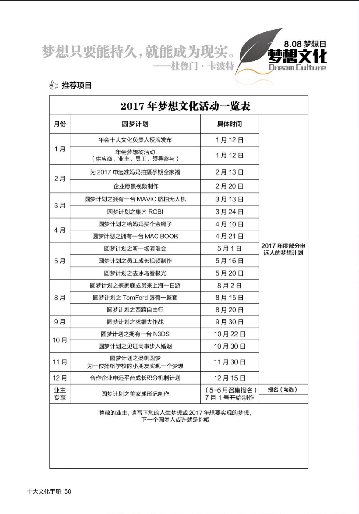 梦想文化,人生大梦想,生活小梦想。梦想文化以梦想卡形式收集申远人和业主会员的梦,梦想团队根据梦想收集内容制定圆梦计划,帮助大家实现梦想。同时2017年,业主还可以报名录制美家形成记等活动记录梦想美家的诞生过程。